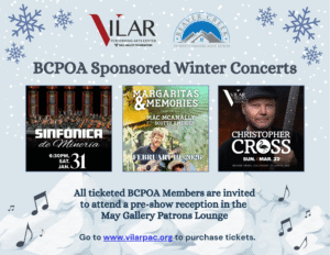 - BCPOA members enjoy exclusive cocktail receptions in the May Gallery Patrons Lounge before four BCPOA-sponsored performances at the Vilar Performing Arts Center—three in the winter and one in the summer each year.